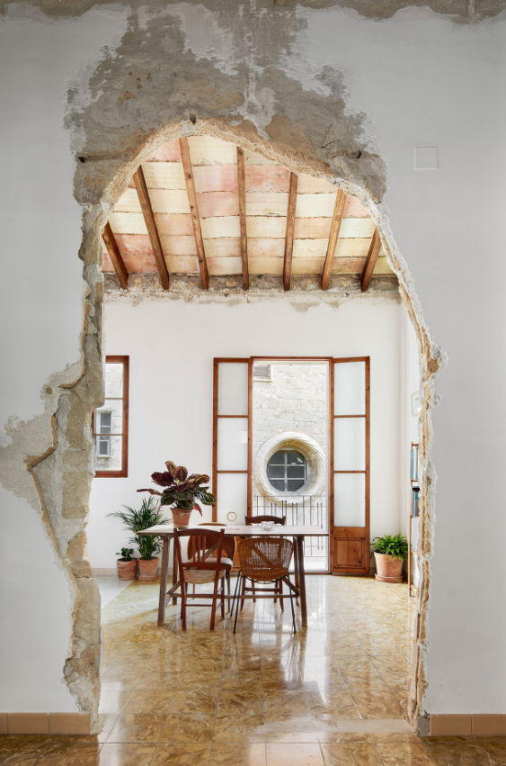 깨어진 벽이나 부분부분 페인트 칠이 벗겨진 모습을 그대로 활용한 예들이다. 오래되고 낡은 건물 내부의 인테리어의 비용을 크게 줄일 수 있는 방법중 하나이다. 과거와 현재를 섞어놓은듯한 인테리어로 독특한 분위기를 갖고있고, 틀에 잡혀있지 않은 자연스러움이 마음을 편하게 해준다.