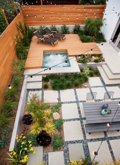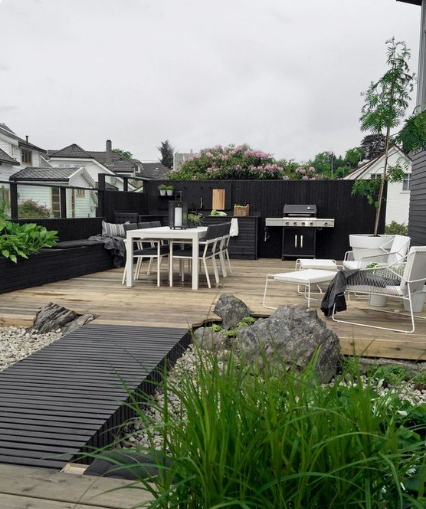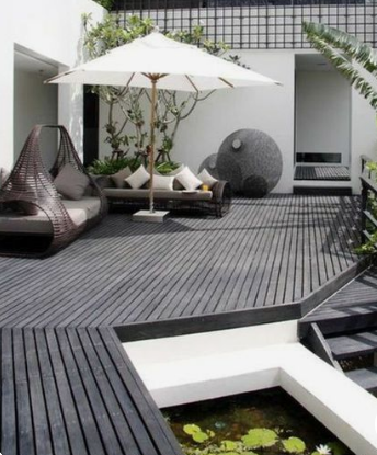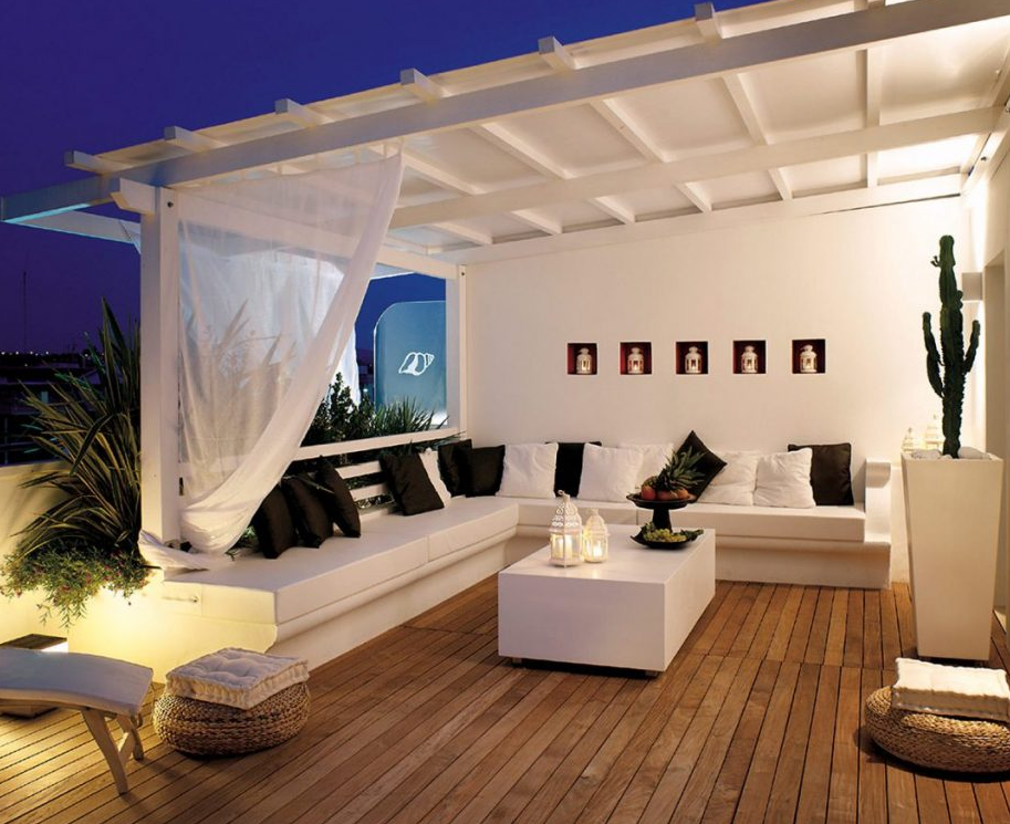 옥상에 가림막이 있는 경우에는 어떤 소재를 쓰더라도 썩거나 지저분해지는 것이 적어진다. 보통 바닥을 나무데크 또는 조립식데크, 인조잔디 등을 이용하는 인테리어가 많다. 자연잔디는 관리하기가 어렵고, 병충해가 많다고 한다.